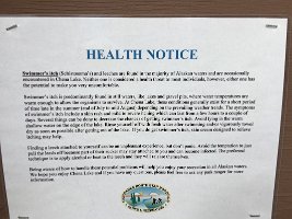 20Health Notice sign we saw after Megan and Phelan went wading in the shallow water. Megan did have a leech on her, no one got swimmer's itch, Chena Lake Recreational Area, North Pole, AK 08-18-2016 16:55 Comments