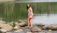 8 Megan on rocks on the separating Lake Itasca from the Mississippi River, Lake Itasca State Park, MN